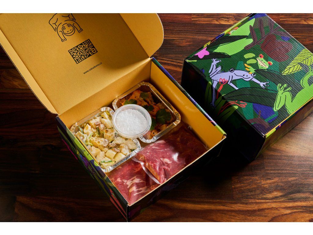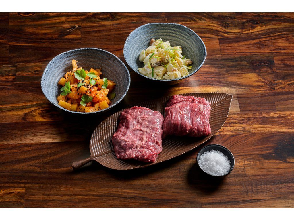 2 x 200 g hovězího pupku z Uruguaye, 120 g ananasového kimchi, 120 g jablečného salátu s ananasem, sůl Maldon.
