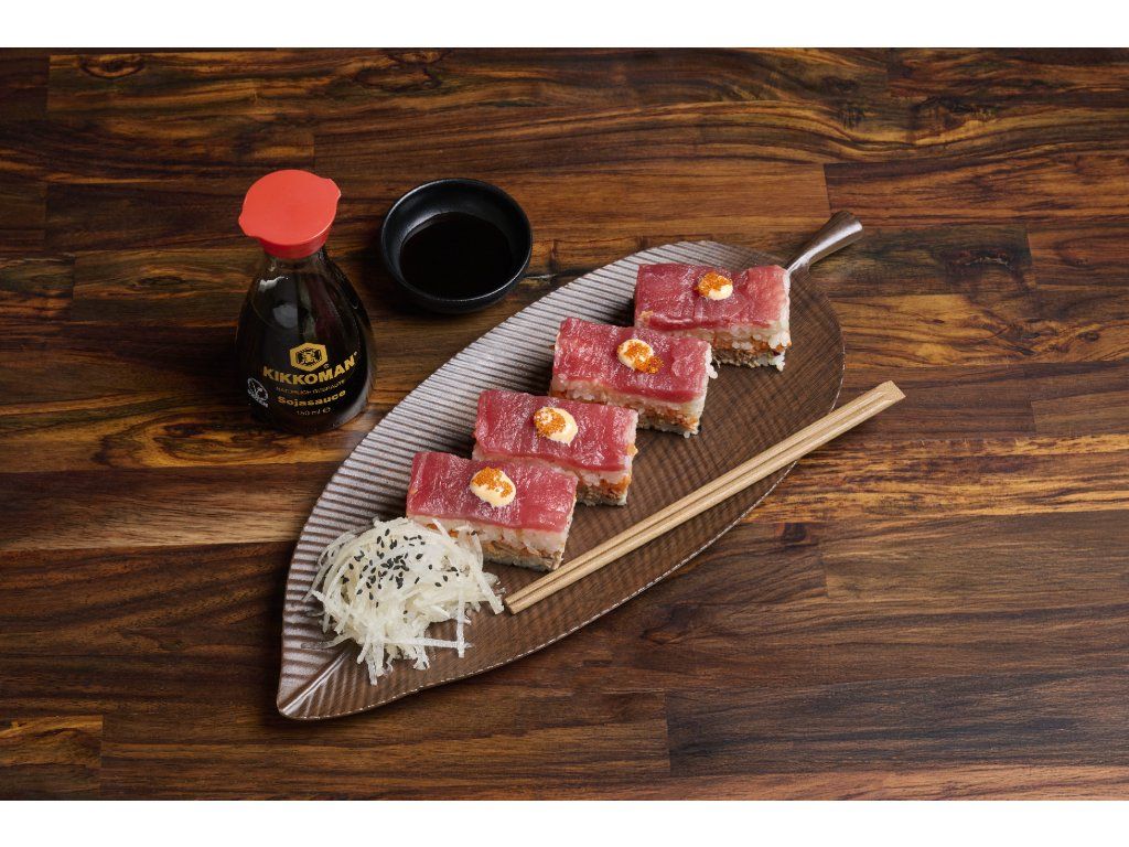 Oshizushi (pressed sushi) je tradiční japonský typ sushi z Ósaky, připravovaný stlačením rýže a surovin (ryby, zelenina) v dřevěné formě zvané oshibako do pevného obdélníkového tvaru. V našem provedení s tuňákem, karotkou, bílou ředkví a majonézou s tobiko kaviárem.